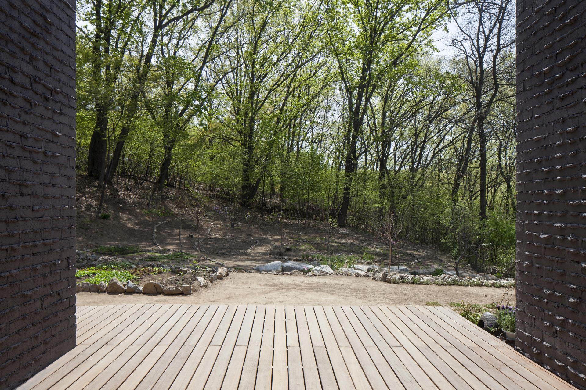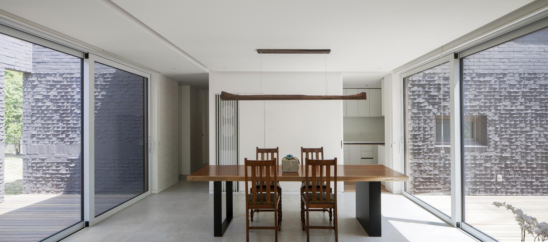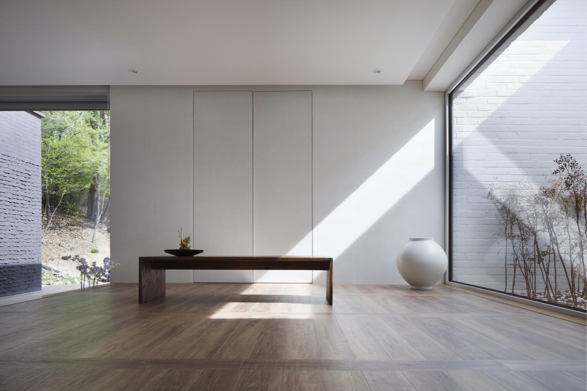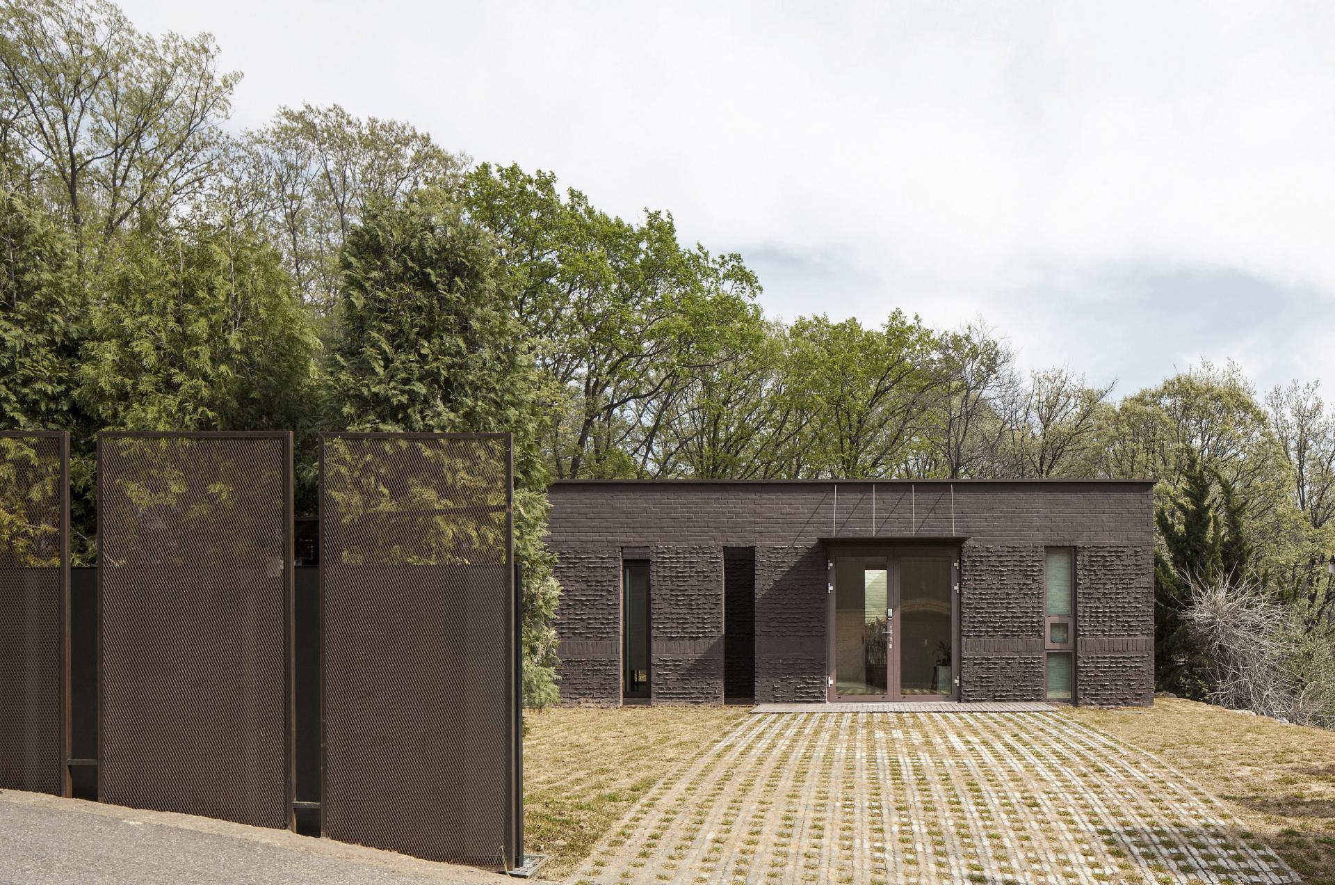 The designer attached special importance on a margin in designing this house, and hoped that this house would be a beautiful space enough only with the surrounding scenery changing continuously day and night seasonally and the change of light and shadow. This margin makes the scenery a hero of the space, because interior space is finished with translucent white Hanji, Korean traditional paper made from mulberry tree. Korean interior composition of space also contributes to highlight this margin. On the contrary, the designer gave naturalness to exterior space by emphasizing rough texture of mortar poked out unevenly between dark bricks piled up with pressure.