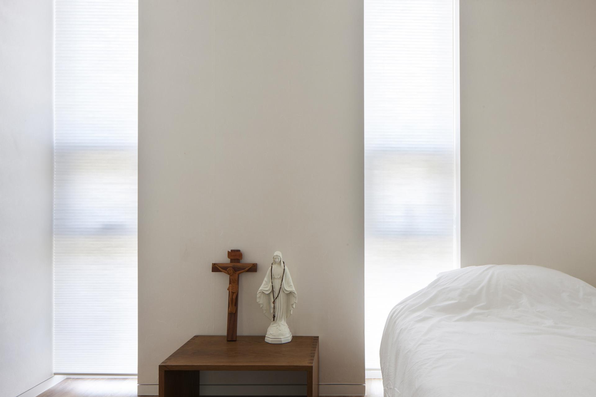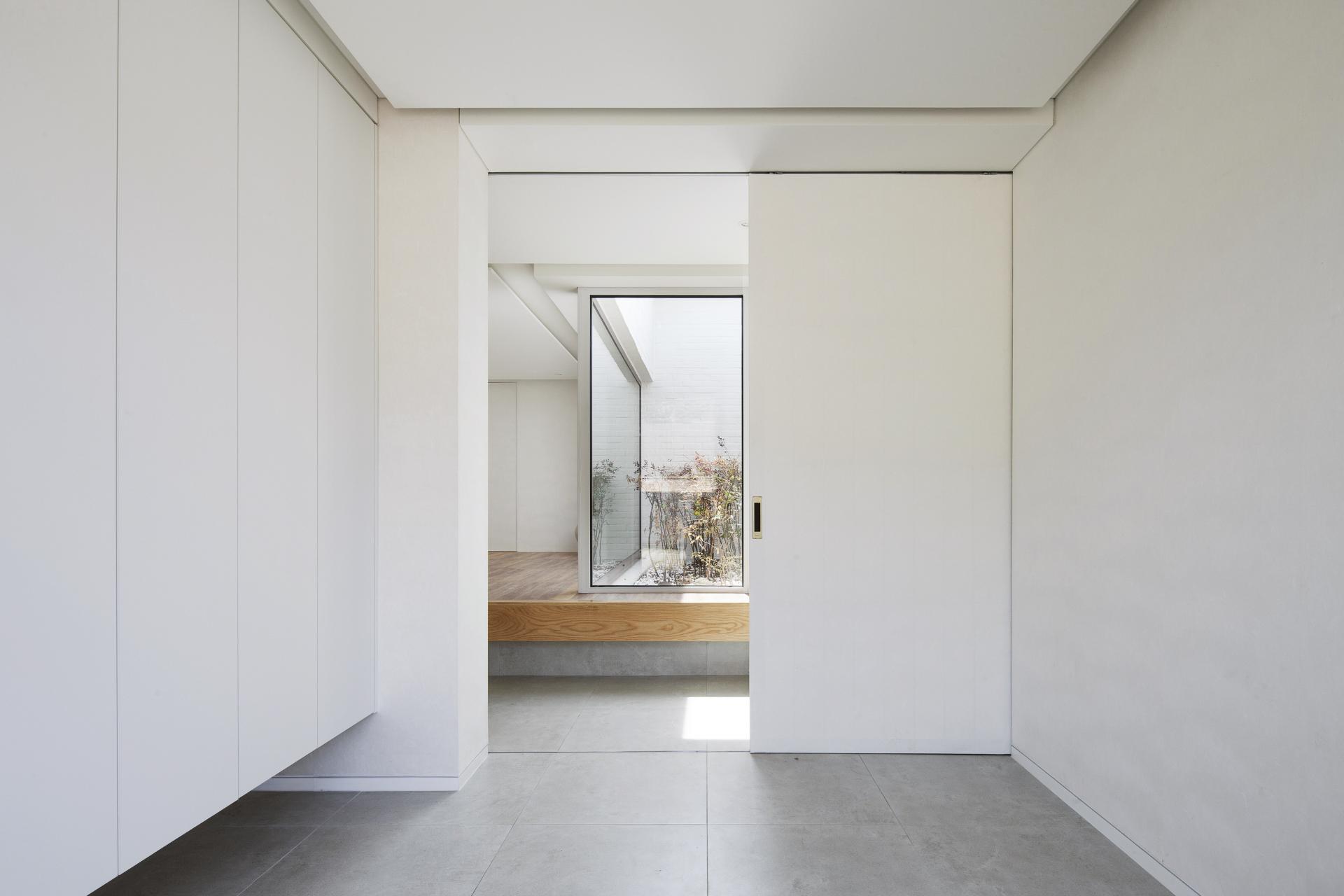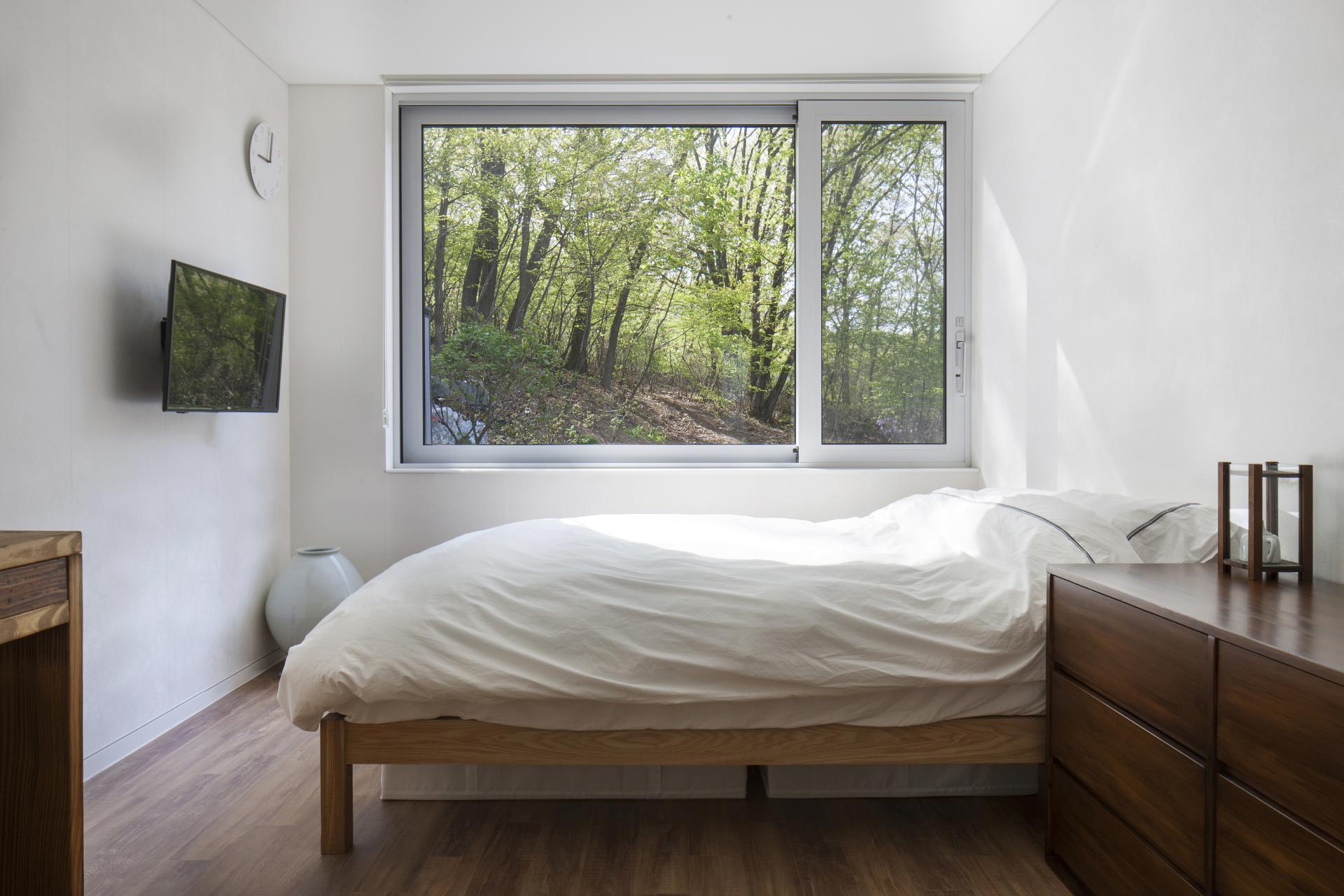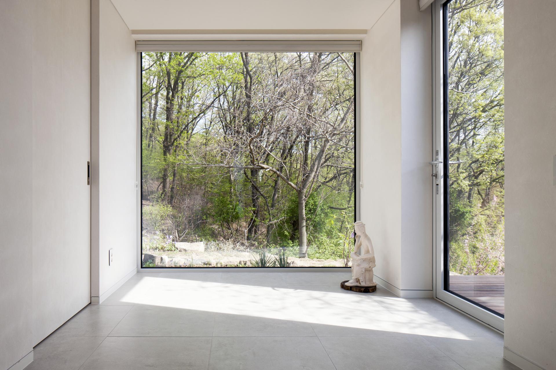 The designer attached special importance on a margin in designing this house, and hoped that this house would be a beautiful space enough only with the surrounding scenery changing continuously day and night seasonally and the change of light and shadow. This margin makes the scenery a hero of the space, because interior space is finished with translucent white Hanji, Korean traditional paper made from mulberry tree. Korean interior composition of space also contributes to highlight this margin. On the contrary, the designer gave naturalness to exterior space by emphasizing rough texture of mortar poked out unevenly between dark bricks piled up with pressure.