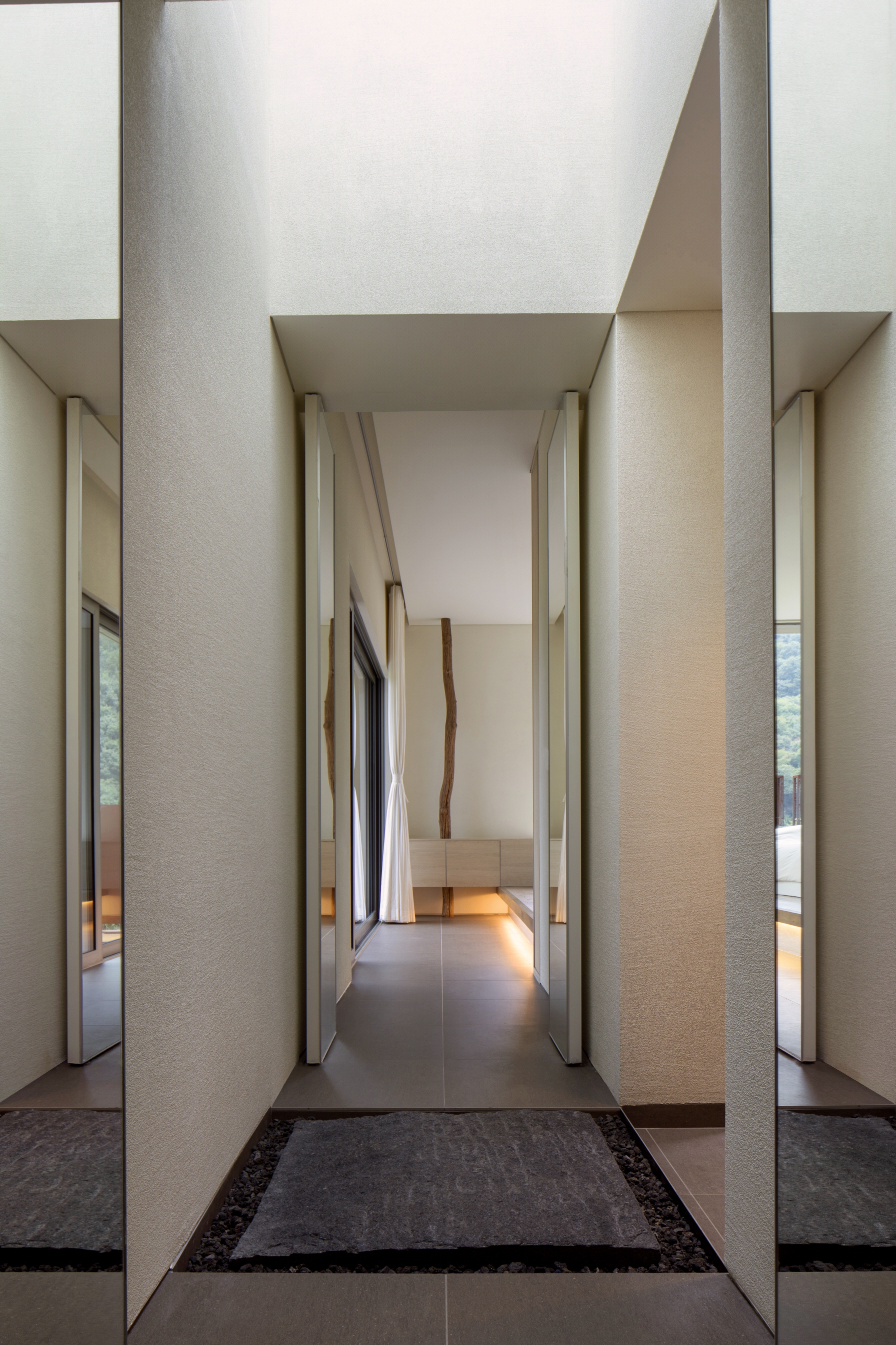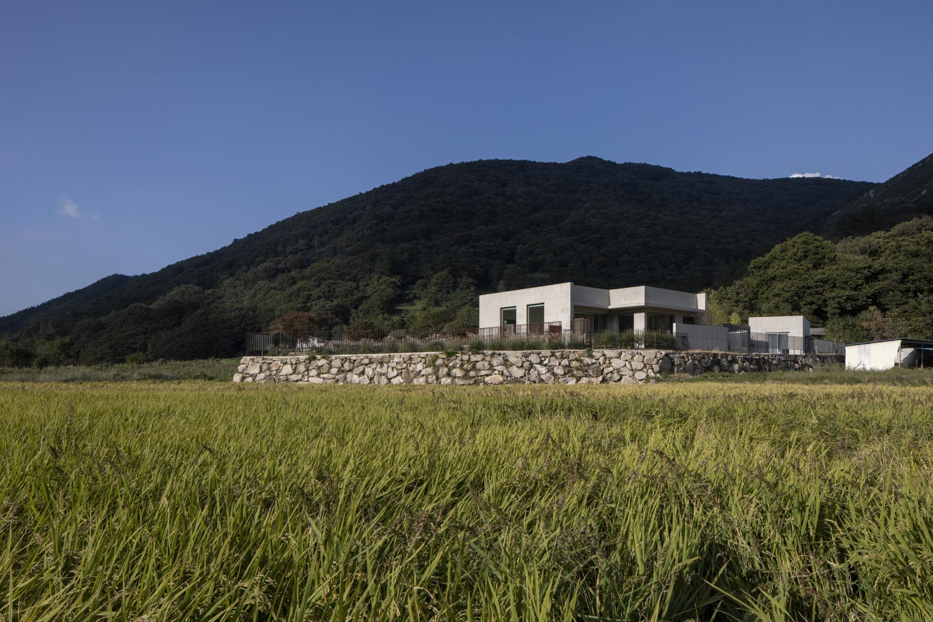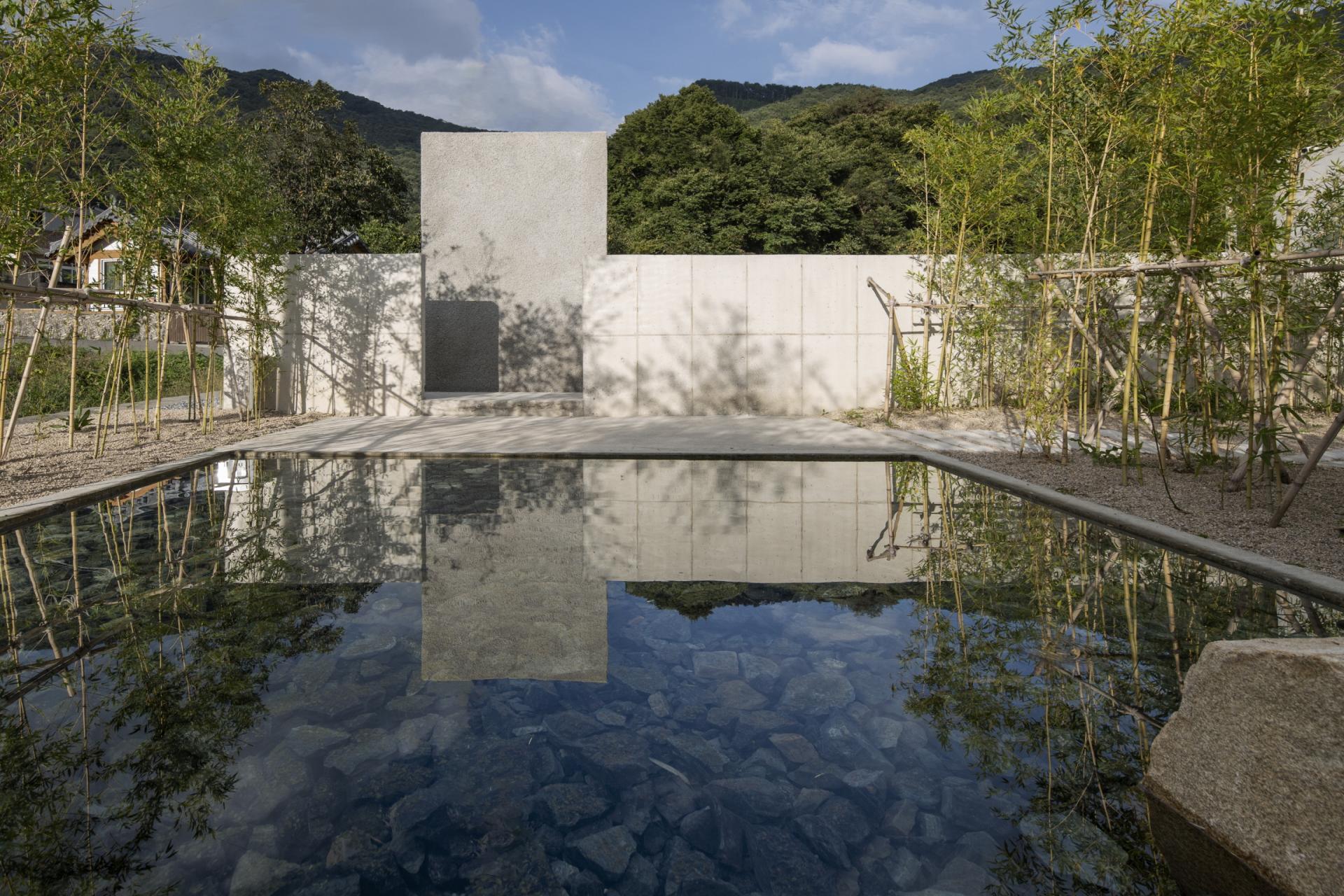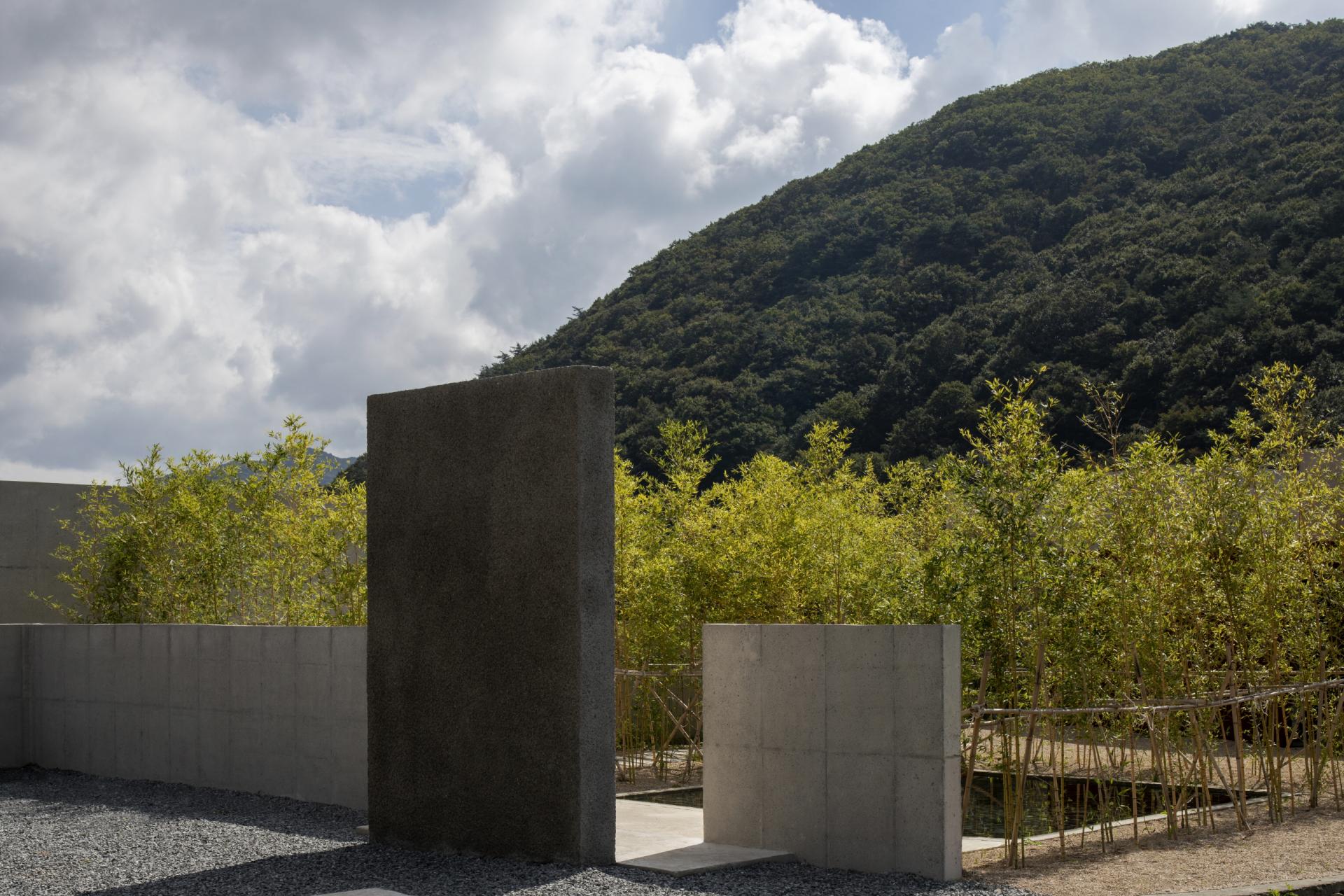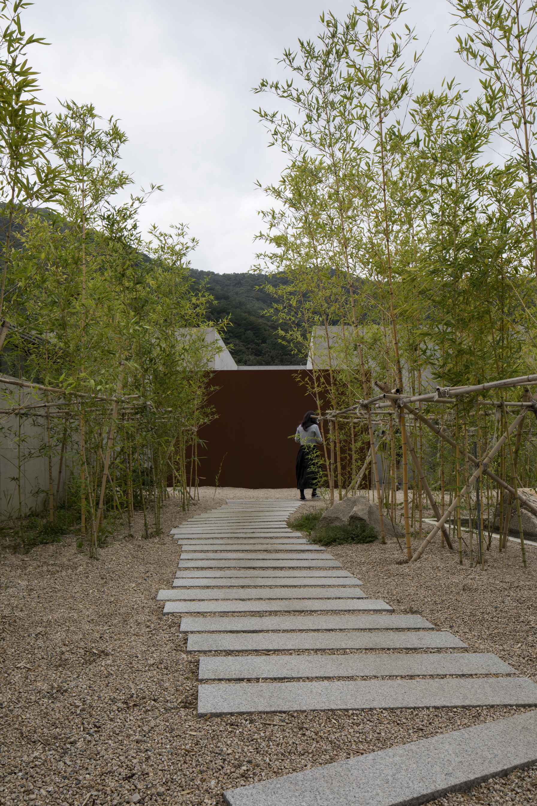 The journey of this location begins with leading the flow of movement using a lump with coarse but hardy properties. This acts as the door of the boundary leading to a mellow world within the freedom of solitude in the middle of the world. Facing the shaded pathway passing through a bamboo forest, the sound of wind, and the sunset projected on the serene pond relaxes the body and heart, and by assimilating to nature, amplifies the aperture between the self and the external world. Though the medium of transference exists, one becomes drenched in the atmosphere like Indian ink gradually diffusing on paper rather than through sudden variation, and the gradual erasure of cached traces allows for focus on rest. Moreover, in the process of entering and exiting the space, the openness toward the mountain and the sky creates an ambiguous boundary and humbly accepts the ambience of the earth while still pursuing only the immersive, idyllic beauty found within the calm of unbroken silence through apt closure.