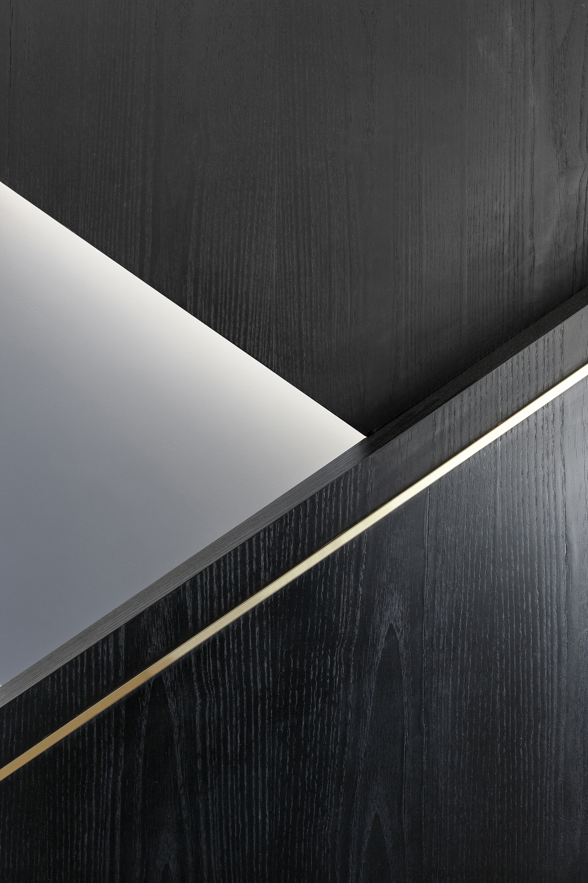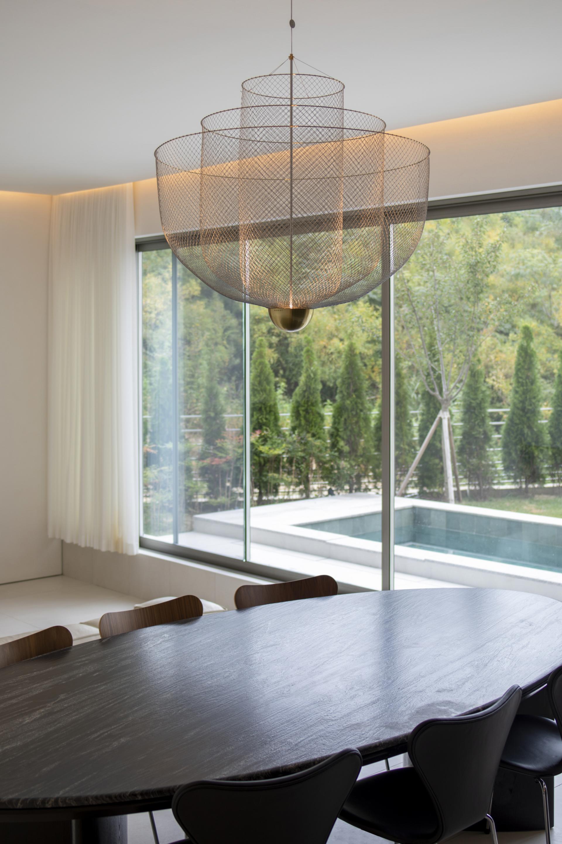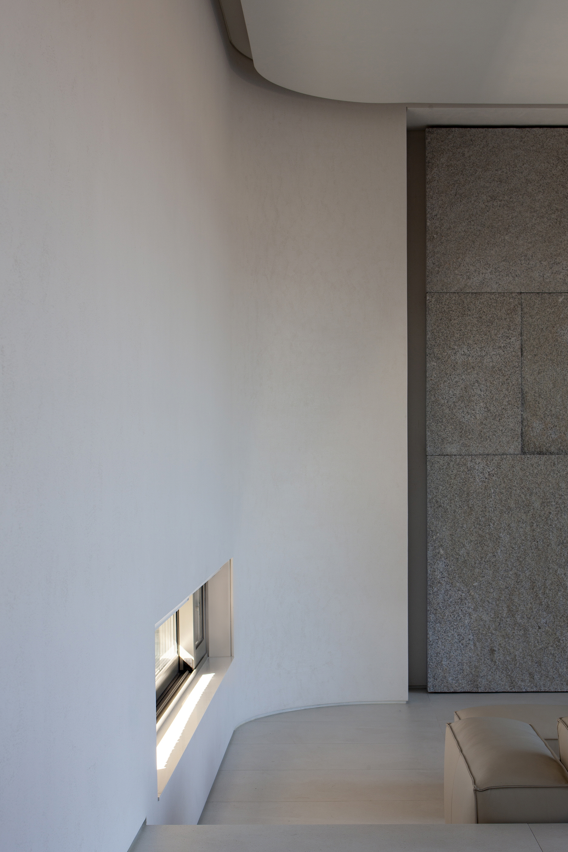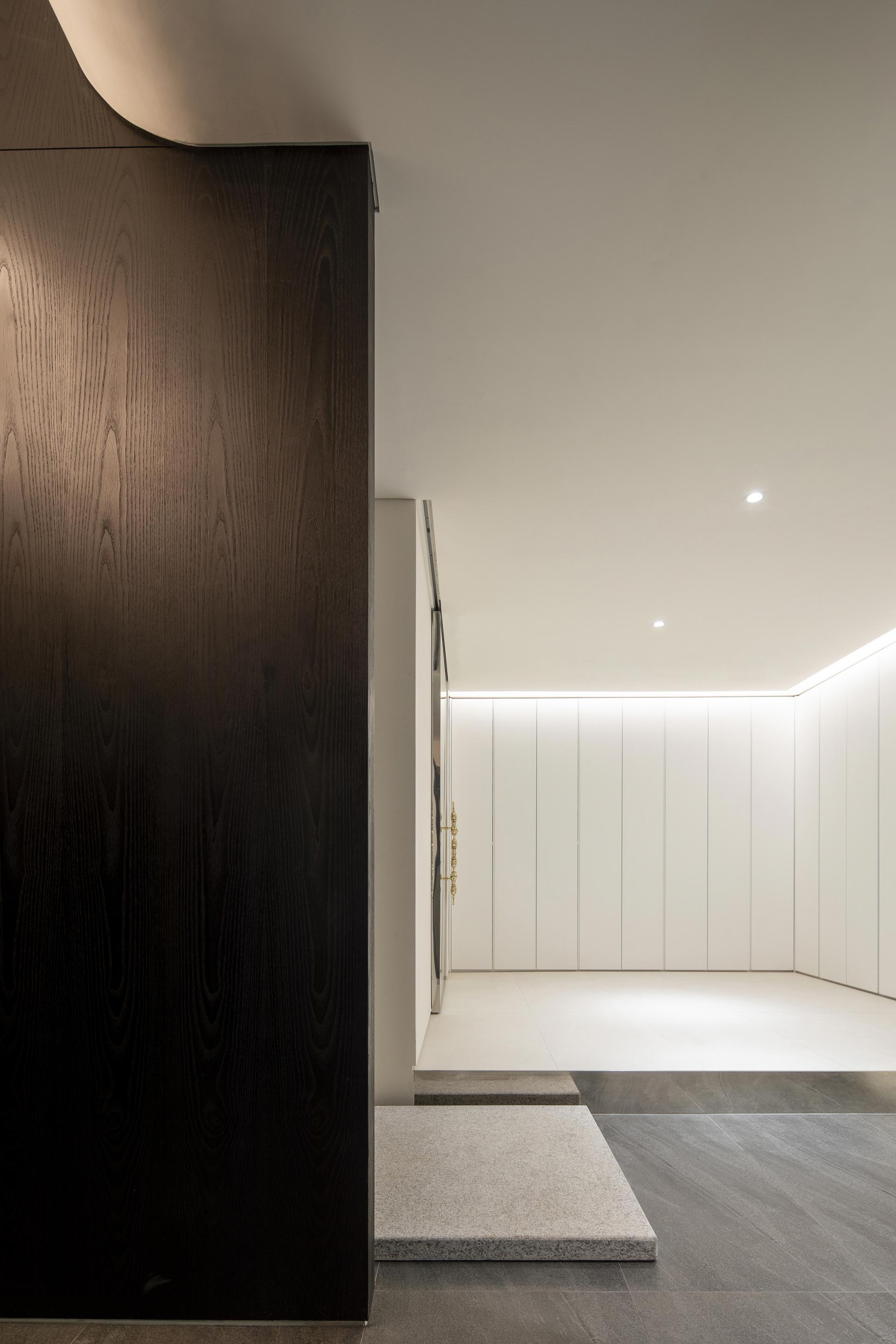 이 주택의 시작과 끝의 인상이 될 현관은 그 기능을 넘어 하나의 공간으로서 사용될 수 있도록 넓은 면적을 할애하여 건축주의 취향과 라이프스타일을 반영했다. 이 공간에서 시작되는 검은 매스는 공간의 곳곳에 크고 작은 경계를 만들어 동선을 유도하며 확장과 수축을 반복한다. 가족이 함께 시간을 공유하도록 계획한 1층은 이 경계 너머 드러나는데, 여러 기능이 복합된 1층은 기능적 경계를 두되 시각적 확장을 극대화하기 위해 단을 두고 뒷산으로 열린 큰 창과 이웃 마당에 면해 있는 남향으로는 빛의 흐름을 인식할 수 있도록 낮은 창을 계획했다. 이는 경계의 끝에 자리한 자연석에 다양한 질감을 만들고 창밖의 풍경과 상호작용함으로 공간의 구심이 된다. 다시, 빛의 유희로 충만한 경계의 수직적 축은 부부의 공용공간과 각자의 개인 공간으로 구성된 2층으로 진입하게 하는데, 이 공간은 클라이언트의 취향과 변화 가능성이 있는 현재와 미래의 라이프 스타일을 반영하여 디자인되었다.