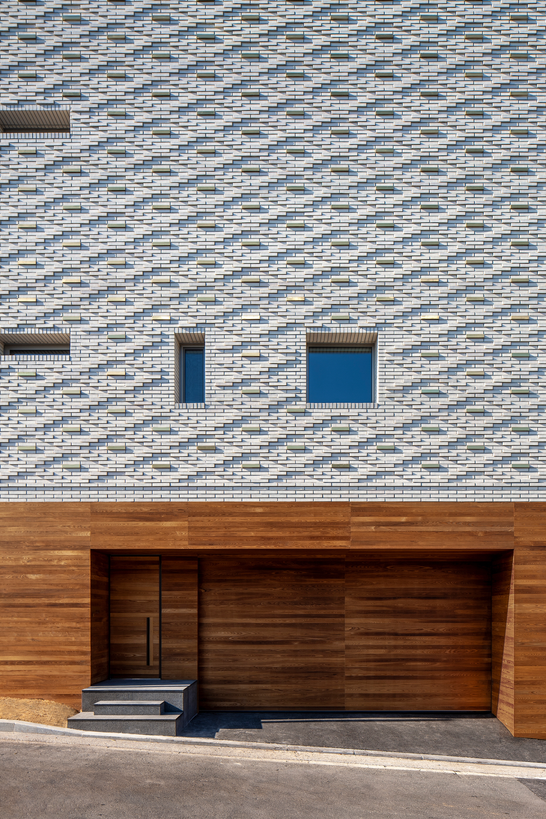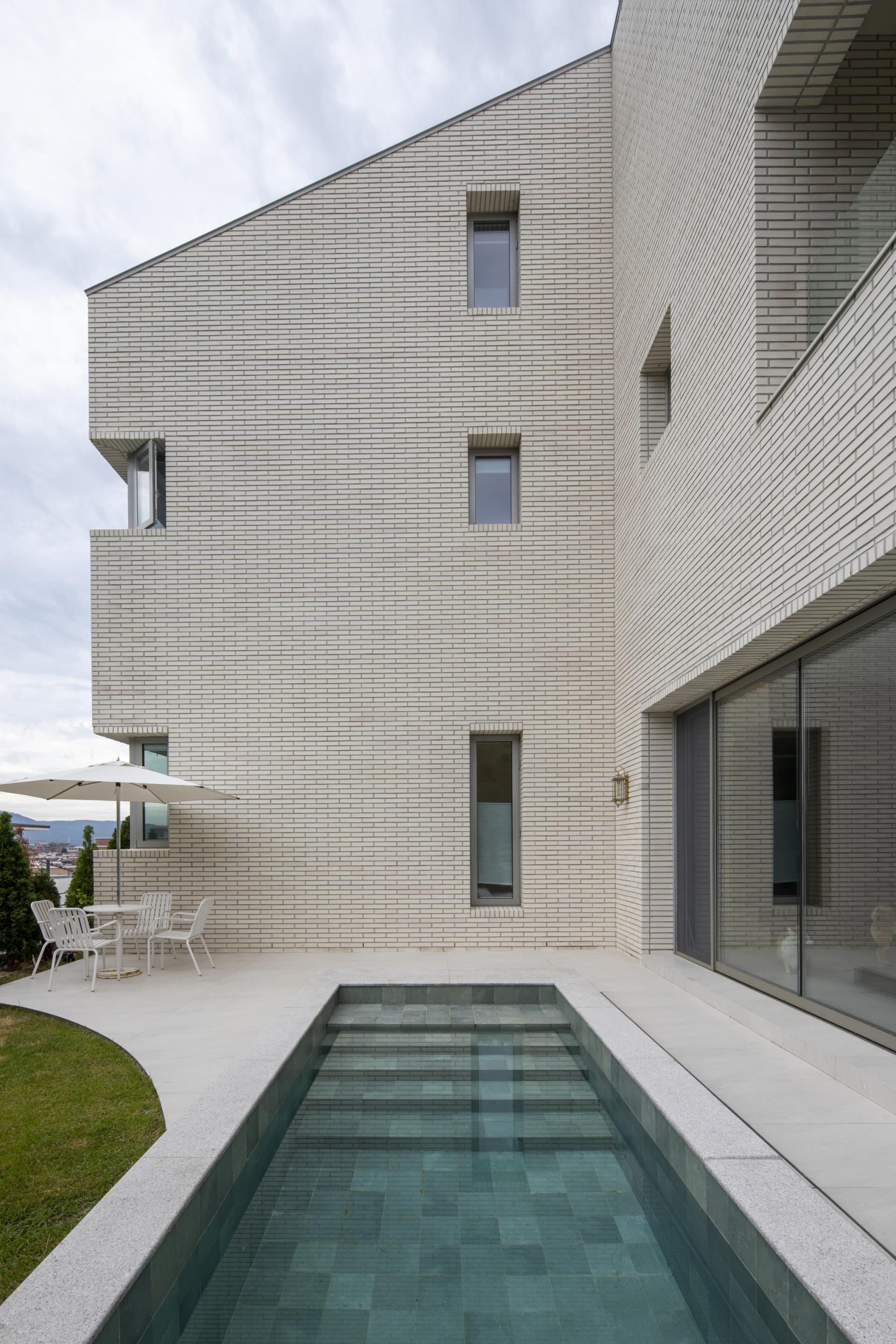 To mitigate the characteristic downside of single household detached home complexes — difficulty in perfectly relieving privacy from adjacent neighbors — we arranged the architecture in an L-shaped form open to the mountain behind the home and aimed to ease the tension of the architectural form closed off to the outside through a unique shell. The architecture open toward the back allows for carrying on time that is unhindered by the surrounding gazes and noise and is safe, as well as earning the freedom of elegant scenery.
