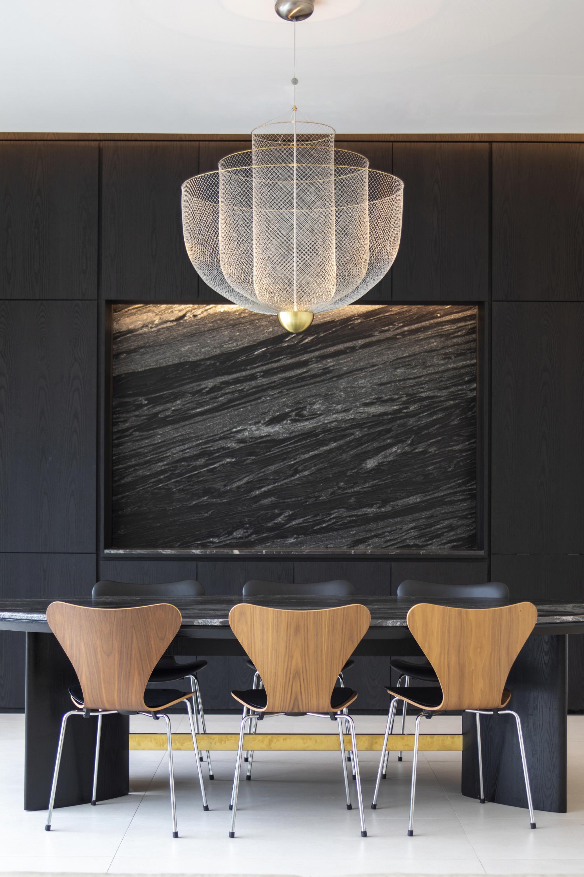 The entrance, which becomes the impression of the beginning and end of this home, had a wide area devoted to it so as to be able to be used as a space beyond its purpose and had the clients’ tastes and lifestyle applied to it. The black mass that begins in this space forms large and small boundaries scattered throughout, inducing the flow of movement and repeating expansion and contraction. The first floor, planned to be an area in which family shares time together, is revealed beyond this boundary; to maintain the functional boundary for the first floor — a space with comprehensive functionality — while maximizing its visual expansion, a step was placed, and a low window was planned for the large window opening to the mountain behind the house and for the Southern direction facing the neighbor’s garden to allow for the recognition of the passage of light. This becomes the central core of the space through the interaction between the varied textures created by the natural stones placed at the end of the boundary and the landscape outside the window. Also, the boundary’s perpendicular axis, saturated with the amusement of light, enters the second floor, which consists of the couple’s shared space and personal spaces, and was designed to reflect the clients’ tastes and their potentially evolving present and future lifestyles.