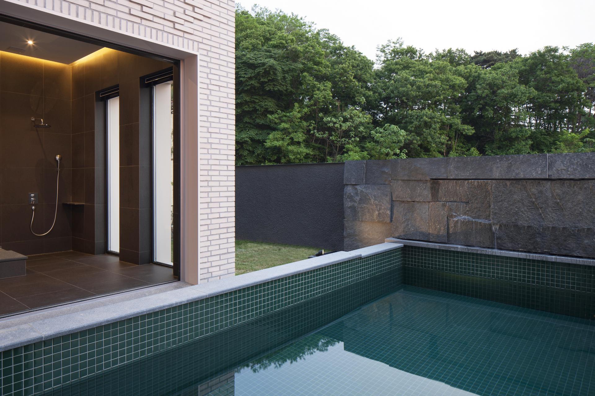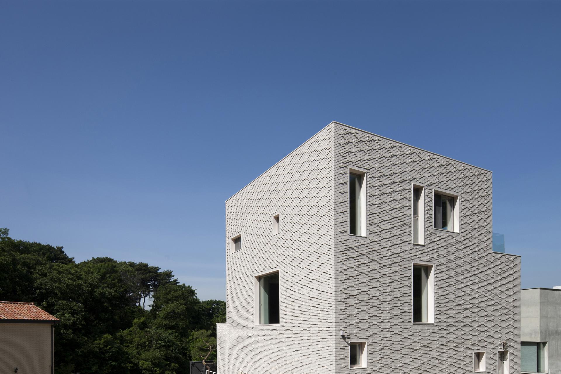 Before designing, 100A associates imagined a boutique hotel only for them. They intended to build a house to show unique lifestyle and also a peculiar house where the clients could enjoy their leisure time to the full. Accordingly, 100A associates used various materials and color senses, differently from the existing tendency that they have aimed at designing only with minimum elements. In particular, an unique pattern made of bricks piled on the simple exterior is in harmony with nature and at the same time reveals the clients'individuality as it is.