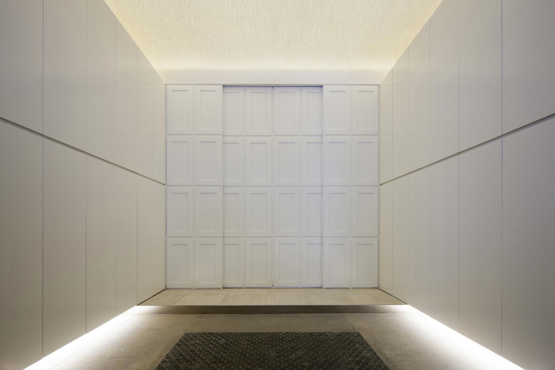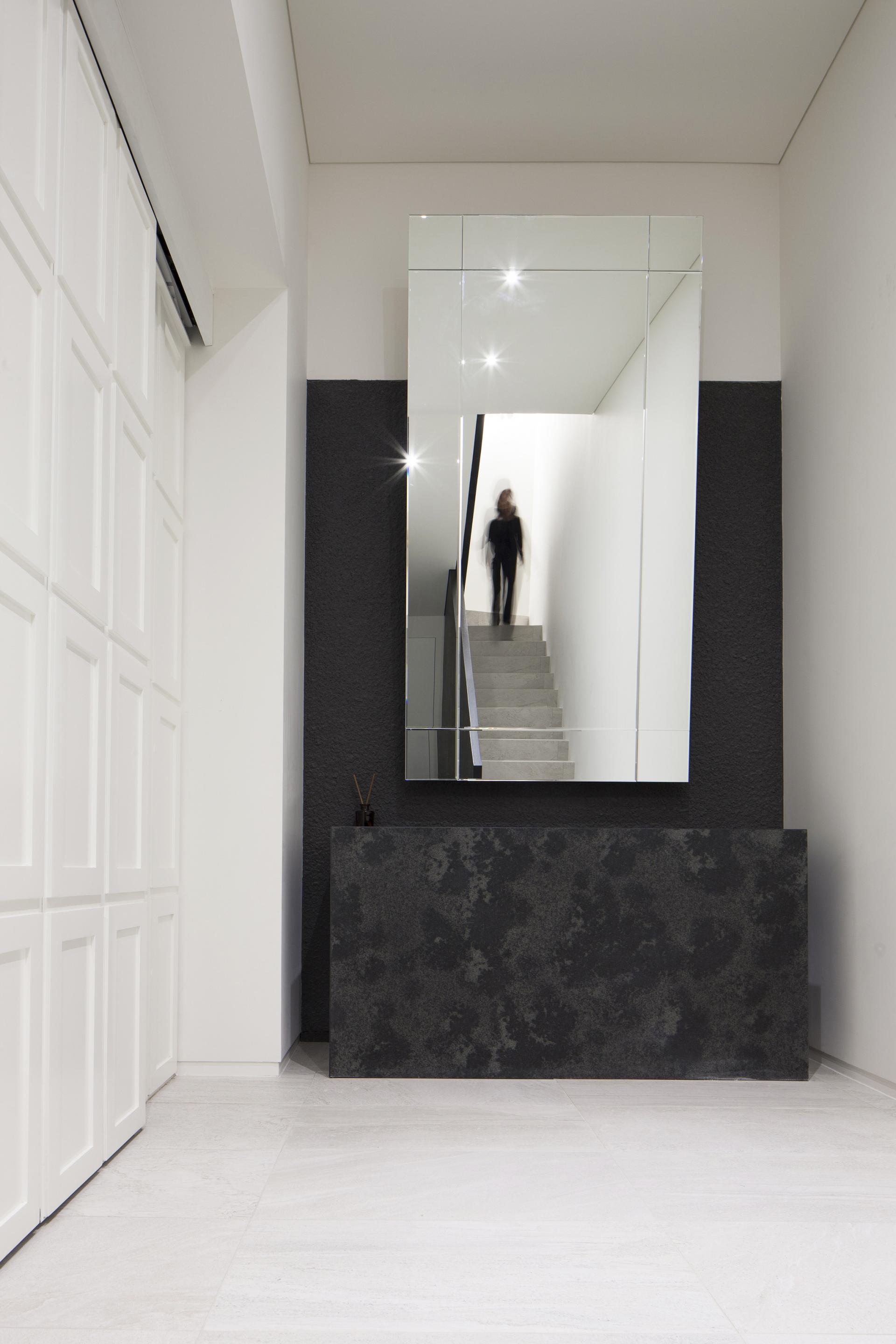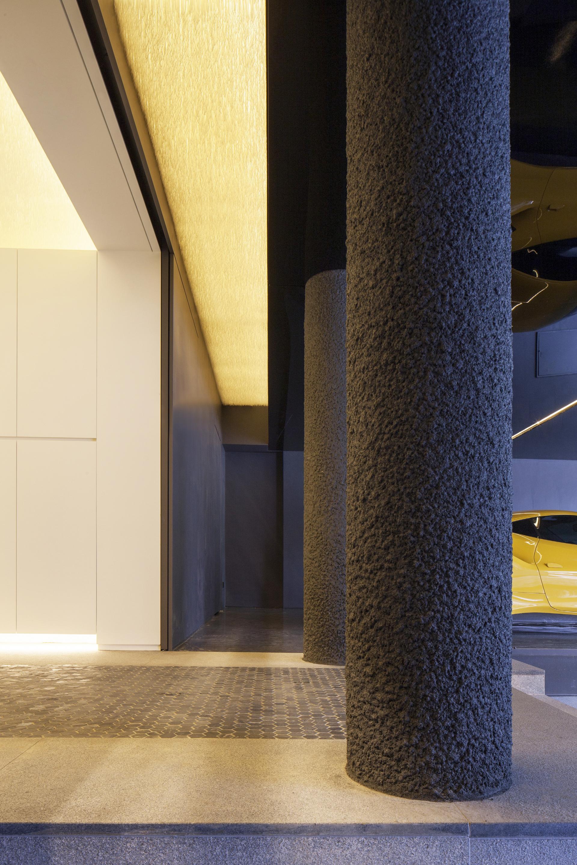 공간에 진입하자마자 마주하게 되는 곳은 주차장이다. 입구에서 현관까지 향하는 길 양쪽에 위용을 드러내는 주차공간이 마련되어 있다. 집이 아닌 자동차 쇼룸처럼 보였으면 좋겠다는 클라이언트의 바람이 반영된 것이다. 계단을 한 층 올라 들어서게 되는 공간에는 더욱 다채로운 색상과 재료들이 적용되었다. 지인들을 초대하여 함께 식사할 수 있는 다이닝룸, 부부의 휴식을 위한 수영장, 자쿠지, 벽천 등은 이들의 생활을 더욱 극명하게 보여준다.